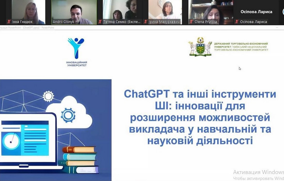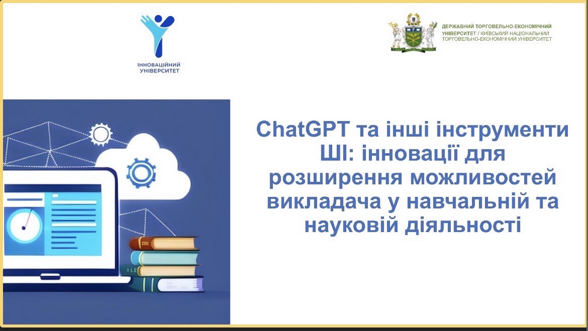 13 вересня 2023 року відбувся науковий вебінар на базі ДТЕУ на тему «ChatGPT та інші інструменти ШІ: інновації для розширення можливостей викладача у навчальній та науковій діяльності» у якому взяли участь наукові педагогічні працівники ВТЕІ ДТЕУ.