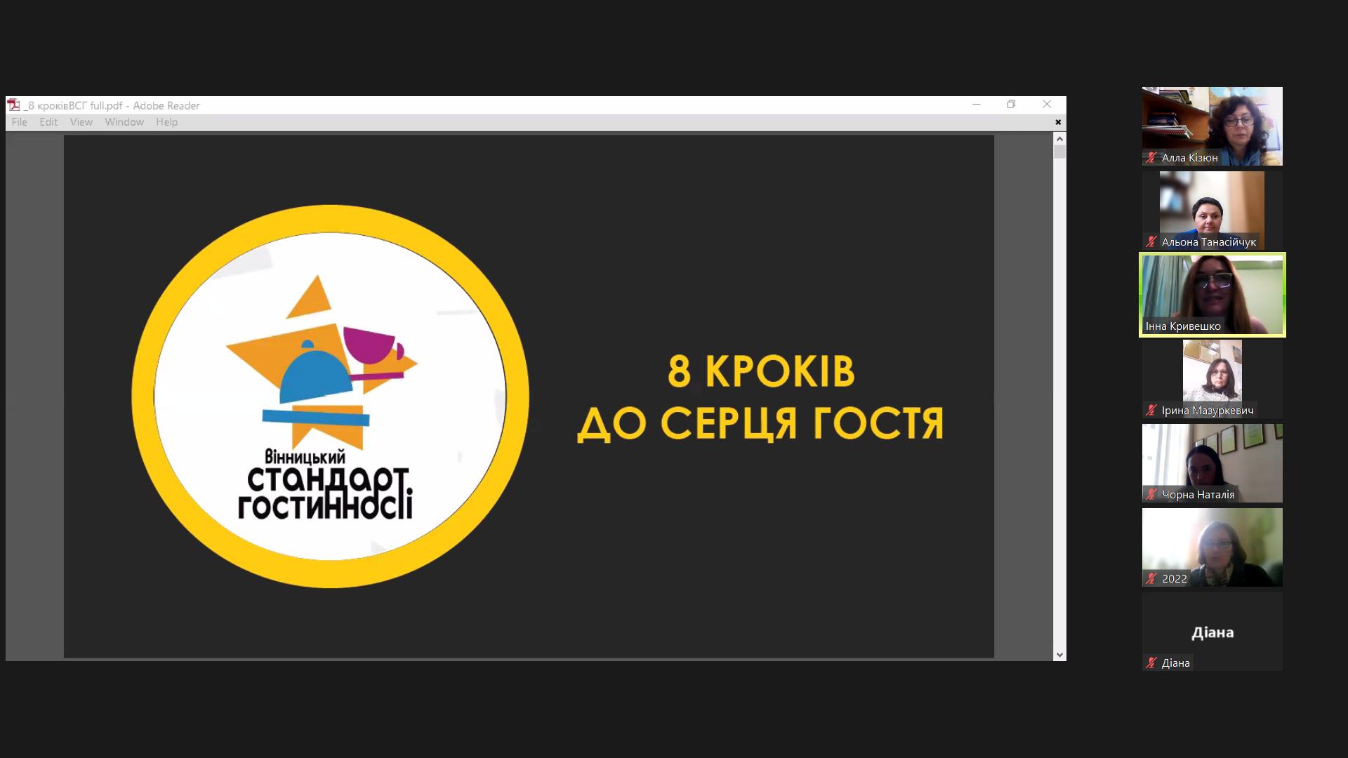 Учасники тренінгу познайомилися з історією створення проекту «Вінницький стандарт гостинності» у м. Вінниця, що реалізувався ГО «Вінницька Асоціація гостинності «Хліб Сіль», Спілкою Підприємців «Стіна» у співпраці з Департаментом маркетингу міста та туризму Вінницької міської ради. У лютому 2022 року Вінницький торговельно-економічний інститут ДТЕУ підписав меморандум, чим публічно заявив про готовність впроваджувати Вінницький стандарт гостинності.