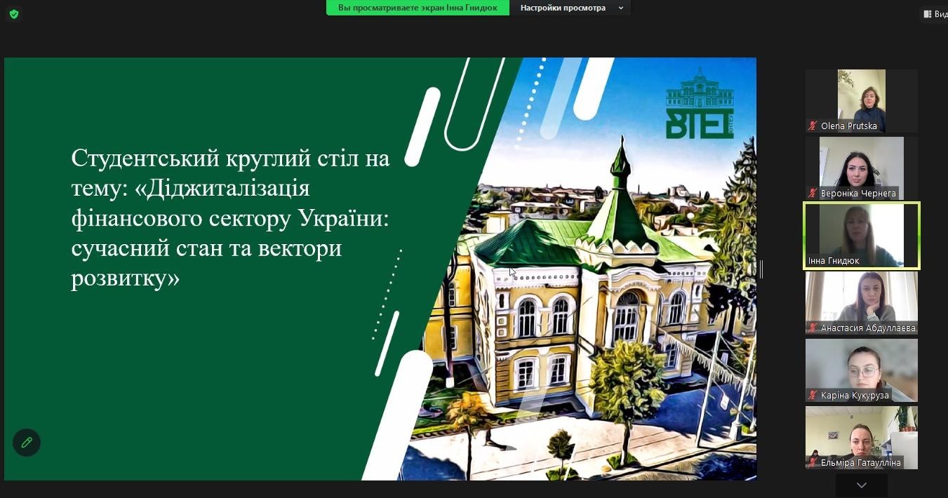 6 квітня 2023 року в рамках тижня обліково-фінансового факультету, кафедрою фінансів, з використанням засобів онлайн-платформи Zoom, було проведено студентський круглий стіл на тему «Діджиталізація фінансового сектору України: сучасний стан та вектори розвитку». У заході взяли участь студенти спеціальності 072 «Фінанси, банківська справа та страхування» Поліського національного університету (м. Житомир) ОС «бакалавр» Вознюк Дарина, ОС «магістр» Пташник Роман, Наумчук Наталія, Данильчук Наталія та Вінницького торговельно-економічного інституту ДТЕУ ОС «молодший бакалавр», «бакалавр» та «магістр». До обговорення тематики долучилися науково-педагогічні працівники кафедри фінансів ВТЕІ ДТЕУ та кафедри фінансів і кредиту Поліського національного університету.
