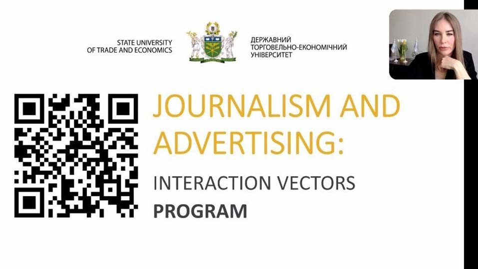 22 березня 2023 року науково-педагогічні працівники кафедри маркетингу та реклами ВТЕІ ДТЕУ взяли участь у V Міжнародній науково-практичній конференції «Журналістика та реклама: вектори взаємодії», яка відбулась у Державному торговельно-економічному університеті (м. Київ) у форматі онлайн та присвячена питанням інтеграції журналістики, реклами та PR-технологій.