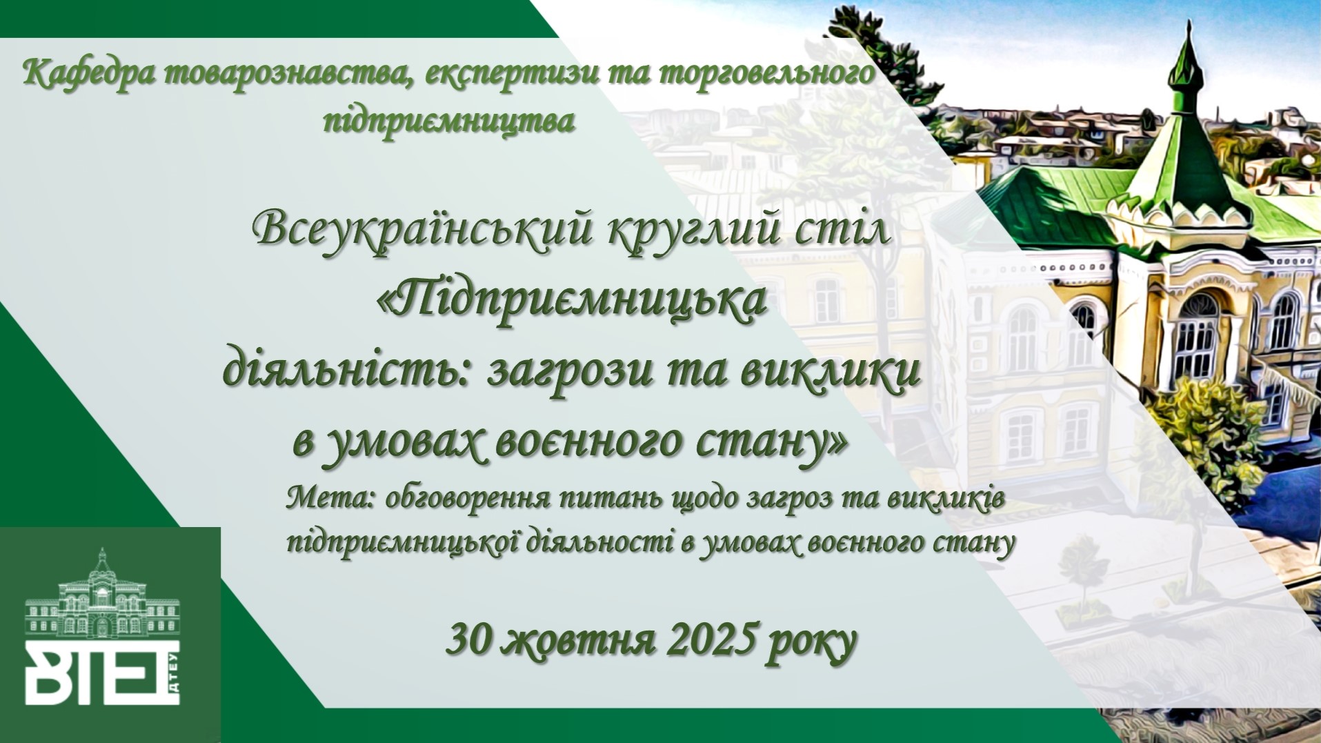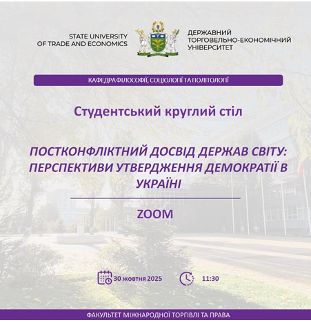 30 жовтня 2025 року кафедрою товарознавства, експертизи та торговельного підприємництва у змішаному форматі проведено Всеукраїнський круглий стіл на тему «Підприємницька діяльність: загрози та виклики в умовах воєнного стану».