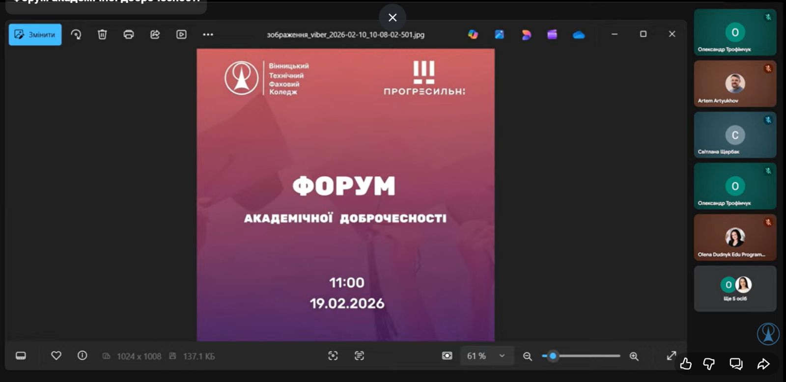 19 лютого 2026 року науково-педагогічні працівники кафедри туризму та готельно-ресторанної справи взяли участь у Форумі академічної доброчесності, ініціатором проведення якого виступила ГО «Прогресильні», а сам захід відбувся на базі Вінницького технічного фахового коледжу.