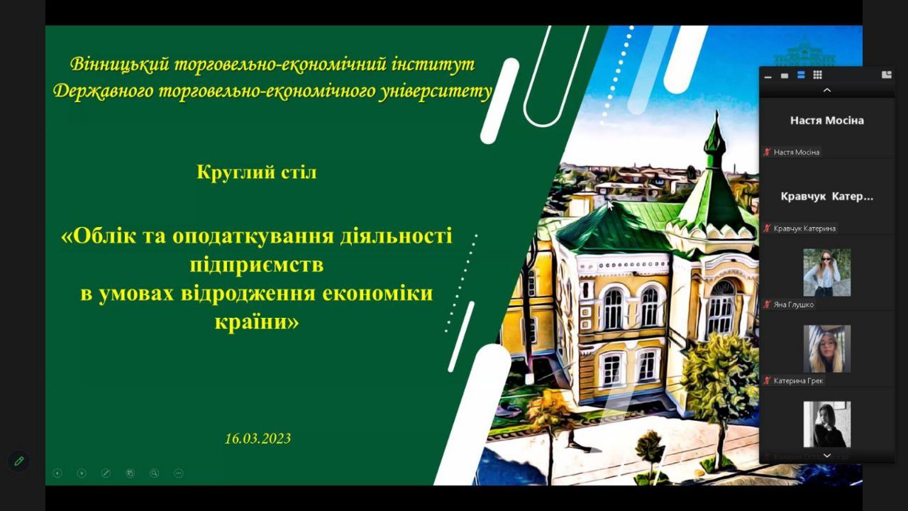 16 березня 2023 року кафедрою обліку та оподаткування Вінницького торговельно-економічного інституту ДТЕУ було проведено студентський круглий стіл «Облік та оподаткування діяльності підприємств в умовах відродження економіки країни».