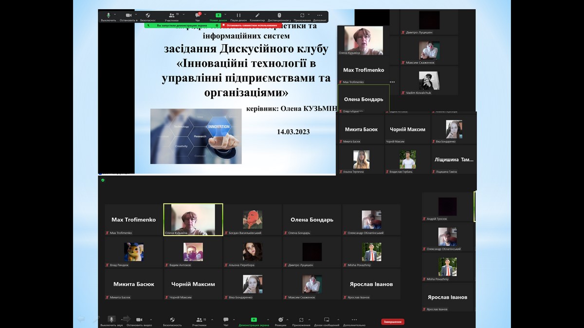 14 березня 2023 року на факультеті економіки, менеджменту та права відбулось відкрите засідання дискусійного клубу «Інноваційні технології в управлінні підприємствами та організаціями» кафедри економічної кібернетики та інформаційних систем, керівник – Кузьміна Олена. У засіданні взяли участь здобувачі освітніх програм «Інформаційні технології у бізнесі» та «Економічна кібернетика». Тема засідання дискусійного клубу «Сучасні технології ефективного управління інформаційно-комунікаційною системою підприємств та організацій». З доповідями виступили: Антохов Вадим (гр. ІСТ-21дс), Бойко Роман (гр. ІСТ-11дс), Бондар Олена (гр. ІСТ-41д), Горбань Владислав (гр. ІСТ-41д), Котов Віталій (гр. ІСТ-31д), Облапінський Олександр (гр. ІСТ-41д), Риндюк Владислав (гр. ІСТ-21дс), Тертична Альона (гр. ІСТ-41д).