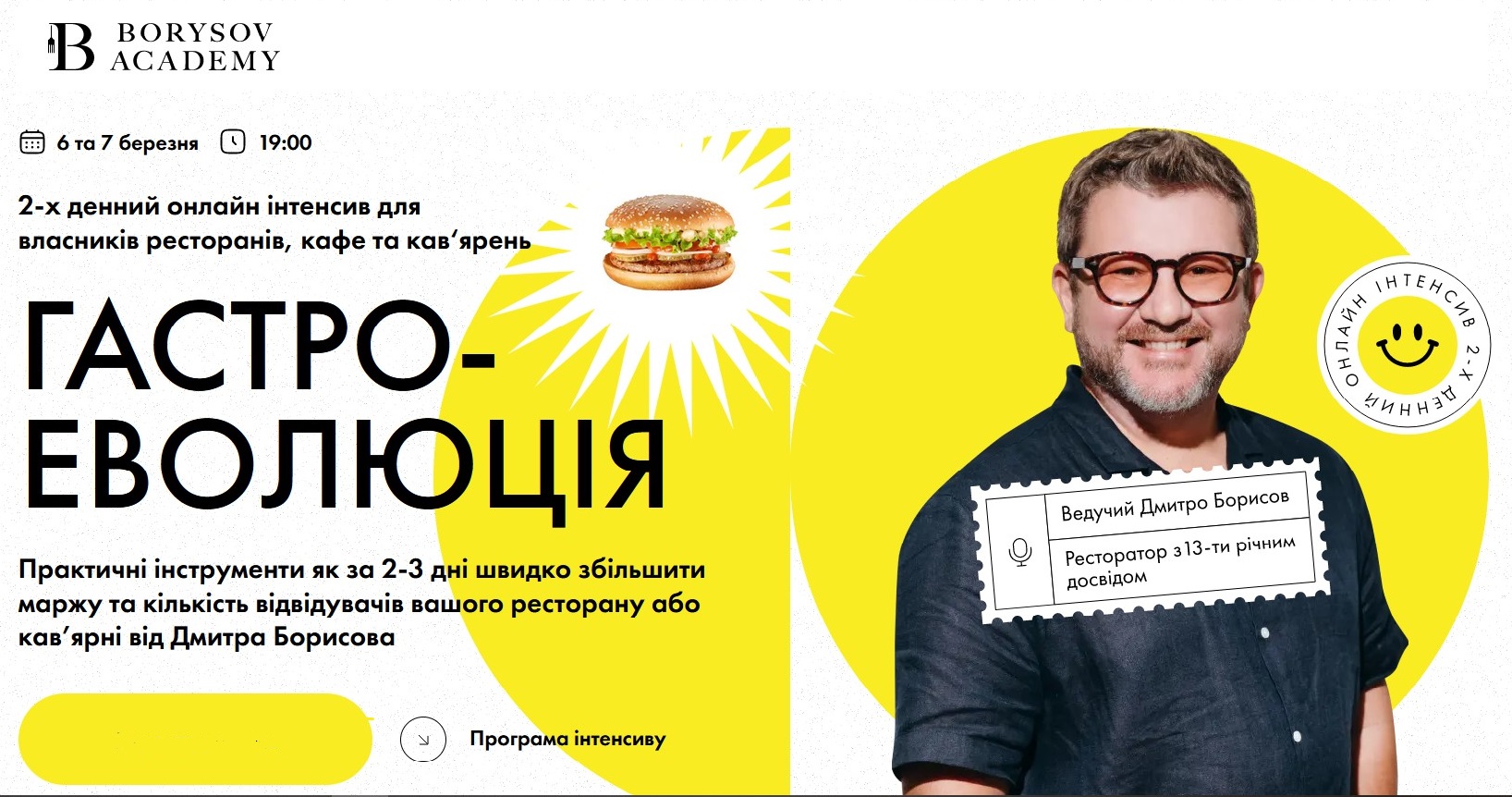 Спікером інтенсиву був Дмитро Борисов – український ресторатор, шеф-кухар, засновник та власник мережі «Сім'я ресторанів Дмитра Борисова» (FoodTech компанії «GastroFamily»), яка об’єднує 15 брендів та більше 80 ресторанів.