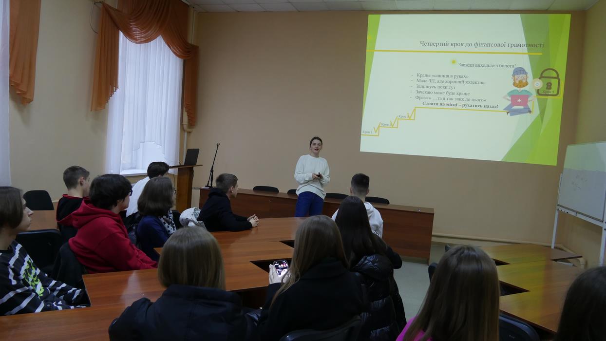 23 січня 2023 року для учнів 10-В класу КЗ «Вінницький ліцей 4 ім. Д.І. Менделєєва» в рамках вивчення курсу «Соціальне шкільне підприємництво», доцент кафедри фінансів Ліна Маршук провела практичне заняття «Фінансова грамотність». Мета заходу - вивчення основних елементів фінансової грамотності та їх практичного застосування.