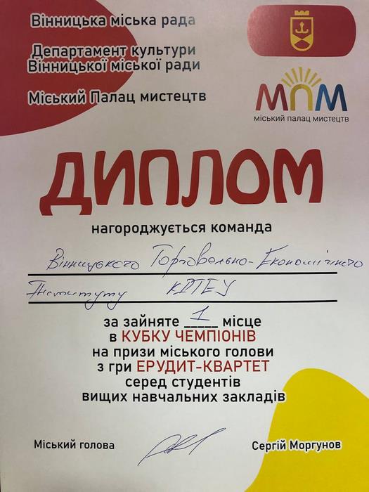 23 січня 2023 року студенти Вінницького торговельно-економічного інституту ДТЕУ взяли участь у змаганнях з командної інтелектуальної гри Ерудит-Квартет серед представників закладів вищої освіти м. Вінниця.
