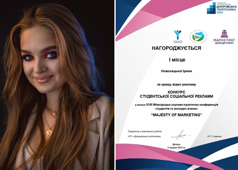 І місце в номінації «Краща відео реклама» отримала Новохацька Ірина, студентка ОС «бакалавр» спеціальності 075 «Маркетинг» групи МР-32д, науковий керівник – Луценко Олександра, старший викладач кафедри маркетингу та реклами ВТЕІ ДТЕУ за відео рекламу під назвою «Допоможи ЗСУ».
