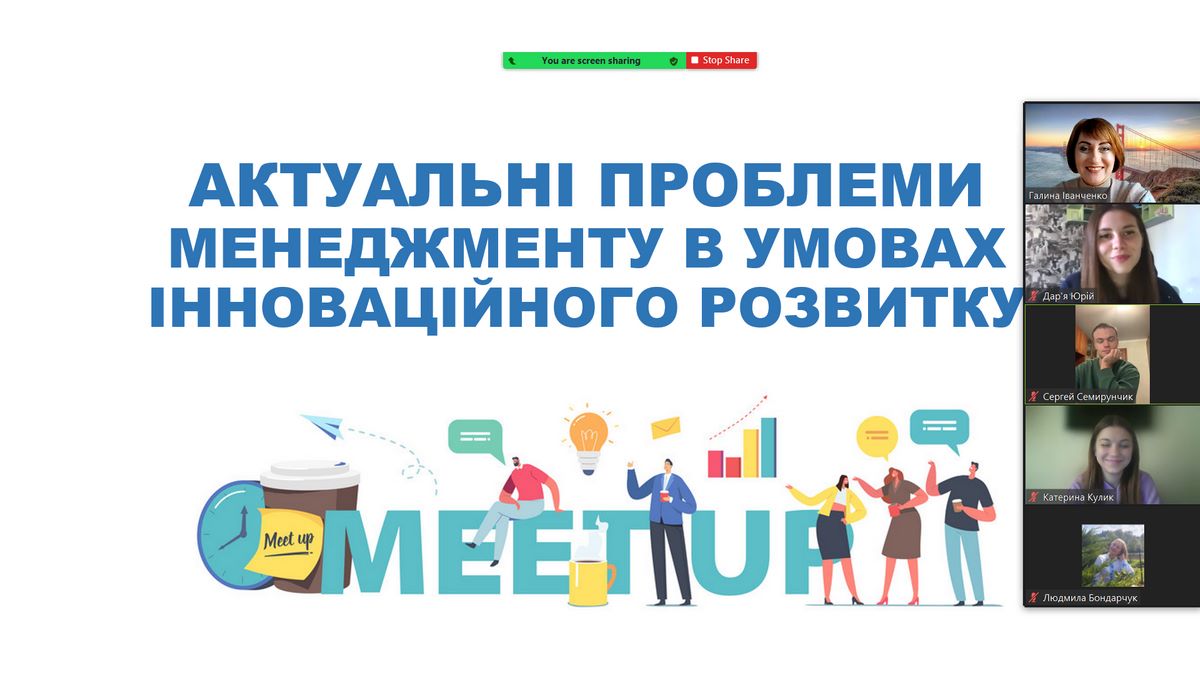 31 жовтня 2022 року викладачами кафедри менеджменту та адміністрування було організовано та проведено мітап «Актуальні проблеми менеджменту в умовах інноваційного розвитку» для здобувачів вищої освіти ступеня «бакалавр» спеціальностей «Менеджмент» і «Публічне управління та адміністрування» та «молодший бакалавр» спеціальності «Менеджмент». Метою заходу було обговорення сучасних тенденцій в сфері управління та пошуку шляхів розвитку України у післявоєнний період.