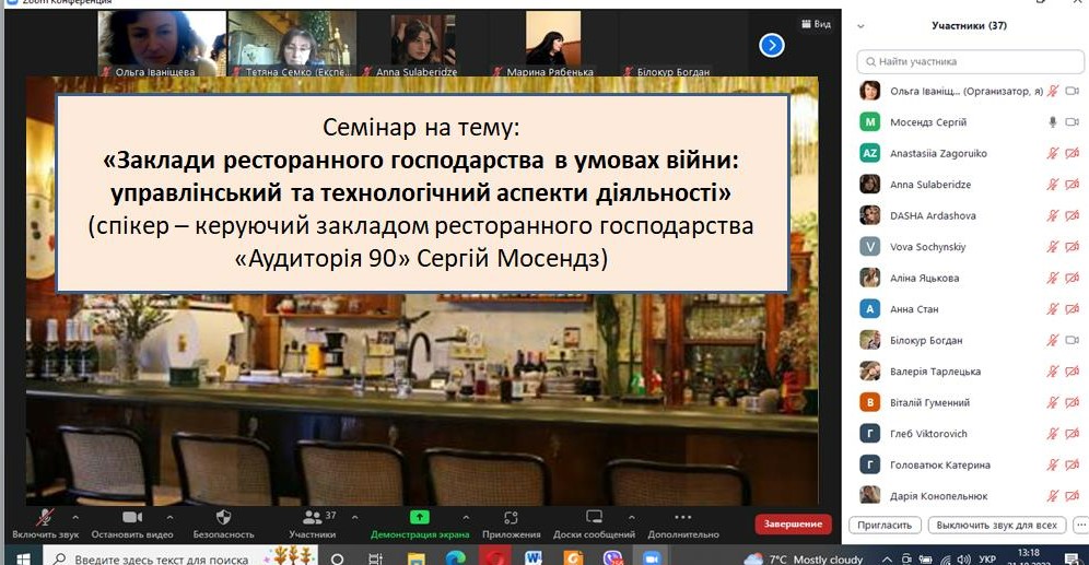 21 жовтня 2022 року для здобувачів вищої освіти за спеціальностями 181 «Харчові технології», 241 «Готельно-ресторанна справа» науково-педагогічними працівниками кафедри туризму та готельно-ресторанної справи було організовано семінар на тему: «Заклади ресторанного господарства в умовах війни: технологічний та управлінський аспекти діяльності», спікером на якому виступив Сергій Мосендз, керуючий закладом ресторанного господарства «Аудиторія 90».