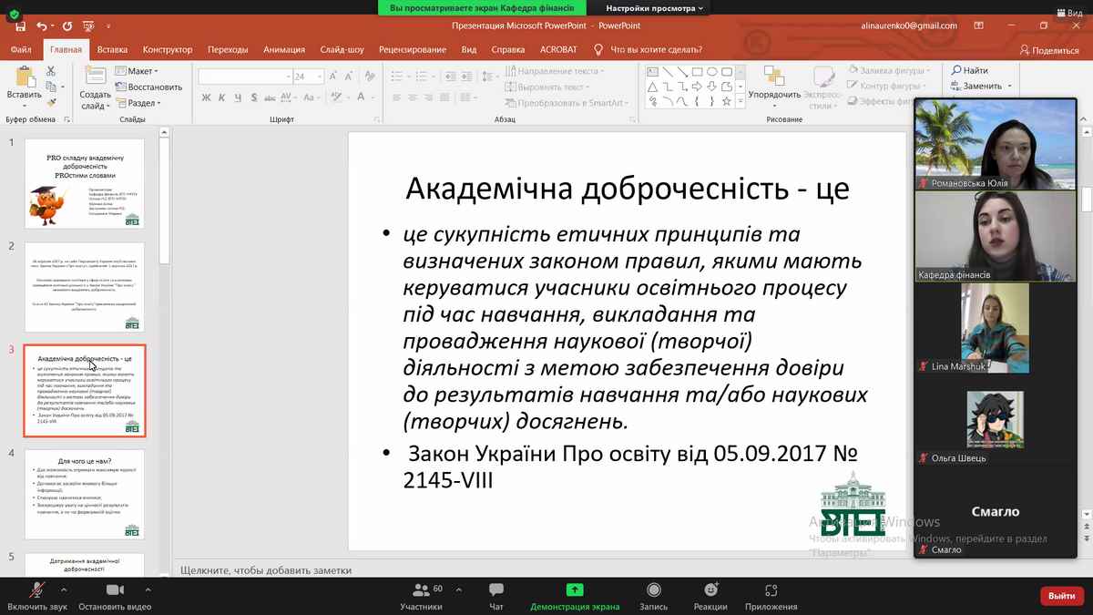 Протягом онлайн-зустрічі на конференції було присутні 64 учасники, між доповідачами та слухачами відбулася активна дискусія щодо основних засад академічної доброчесності. Студенти з радістю долучилися до розгляду та обговорення ситуаційних задач, ділилися особистим досвідом та пережитими емоціями, висловлювали власні погляди та пропозиції щодо закріплення та дотримання засад академічної доброчесності.