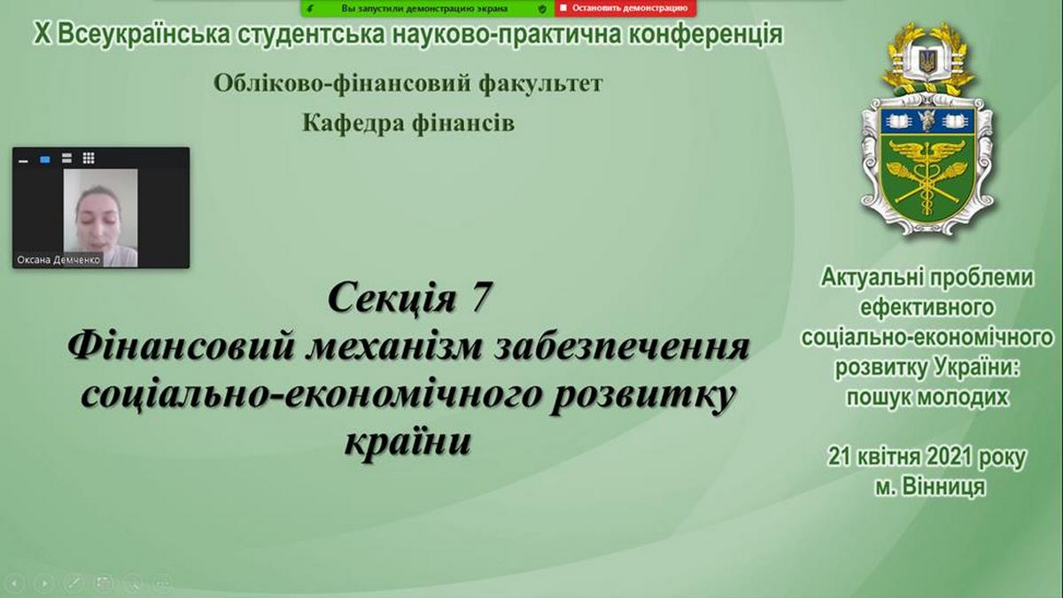 21 квітня 2021 року кафедрою фінансів організовано і проведено в режимі online на платформі Zoom секційне засідання «Фінансовий механізм забезпечення соціально-економічного розвитку країни» Х Всеукраїнської студентської науково-практичної конференції «Актуальні проблеми ефективного соціально-економічного розвитку України: пошук молодих». Засідання секції відкрила керівник секції к.е.н., доцент Оксана Демченко, з вітальним словом виступила завідувачка кафедри фінансів к.е.н., доцент Інна Гнидюк.