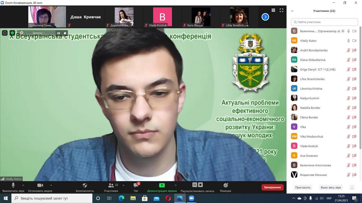 21 квітня 2021 року в рамках Х Всеукраїнської студентської науково-практичної конференції «Актуальні проблеми ефективного соціально-економічного розвитку України: пошук молодих» у Вінницькому торговельно-економічному інституті КНТЕУ відбулося засідання секції №5 «Моделювання та проєктування процесів управління в соціально-економічних системах з використанням інформаційних технологій», керівник секційного засідання – к.т.н., доцент Кузьміна О.М.