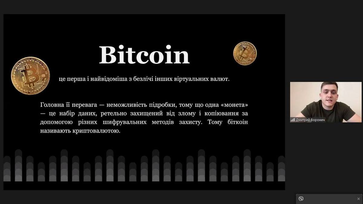 Дмитро займається дослідженням визначення правового статусу криптовалюти у законодавстві України та зарубіжних країн. Він розповів студентам про виникнення криптовалюти, про стан та тенденції розвитку, зазначив, що є загальне розуміння, що криптовалюти являють собою одиниці вартості, які зберігаються на електронних пристроях, використовуються як засоби платежу, а транзакції здійснюються за допомогою криптографії, але на сьогодні не мають свого законодавчого закріплення в Україні. У Верховній Раді України зареєстровано кілька законопроектів щодо обігу криптовалют, які демонструють різні підходи до правової кваліфікації цього інституту. Дмитро також відповів на запитання студентів пов’язаних з використанням криптовалюти.