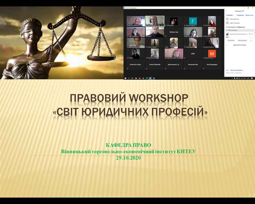 29 жовтня 2020 року кафедрою право для здобувачів освітнього ступеня «бакалавр» спеціальності 081 «Право», 1-4 курсів, був організований в режимі ОНЛАЙН Правовий workshop «Світ юридичних професій».