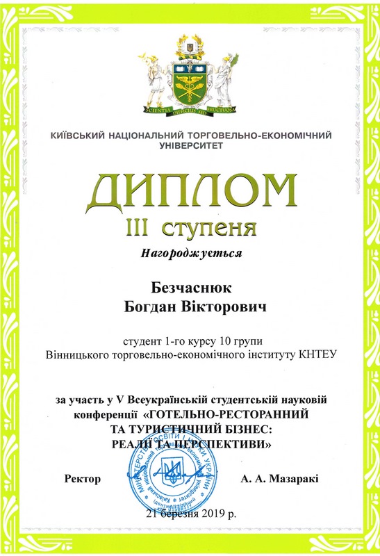 21 березня студент групи ТКЛ 11д(м) Безчаснюк Богдан взяв участь у V Всеукраїнській студентській науковій конференції «Готельно-ресторанний та туристичний бізнес: реалії та перспективи» на базі КНТЕУ (м. Київ) із доповіддю на тему «Переваги застосування секційних занять з різних видів спорту в процесі фізичного виховання студентів (на прикладі ВТЕІ КНТЕУ)». За результатами конференції Безчаснюка Богдана нагороджено Дипломом ІІІ ступеня. Науковий керівник – Сальникова Світлана Володимирівна, завідувач кафедри фізичного виховання та спорту ВТЕІ КНТЕУ, канд. наук з фіз. виховання і спорту, доцент.