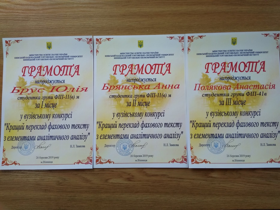 26 березня 2019 року на кафедрі іноземної філології та перекладу відбувся заключний етап вузівського конкурсу «Кращий переклад фахового тексту з елементами аналітичного аналізу». Всього в конкурсі взяли участь 28 здобувачів вищої освіти вечірньої форми навчання спеціальності «Філологія» (ФІП-11(м)в, ФІП-41в, ФІП-21в, ФІП-11в). Учасники конкурсу випробували себе у перекладі усталених виразів, власних імен та прозових творів з англійської на українську та з української на англійську мови.