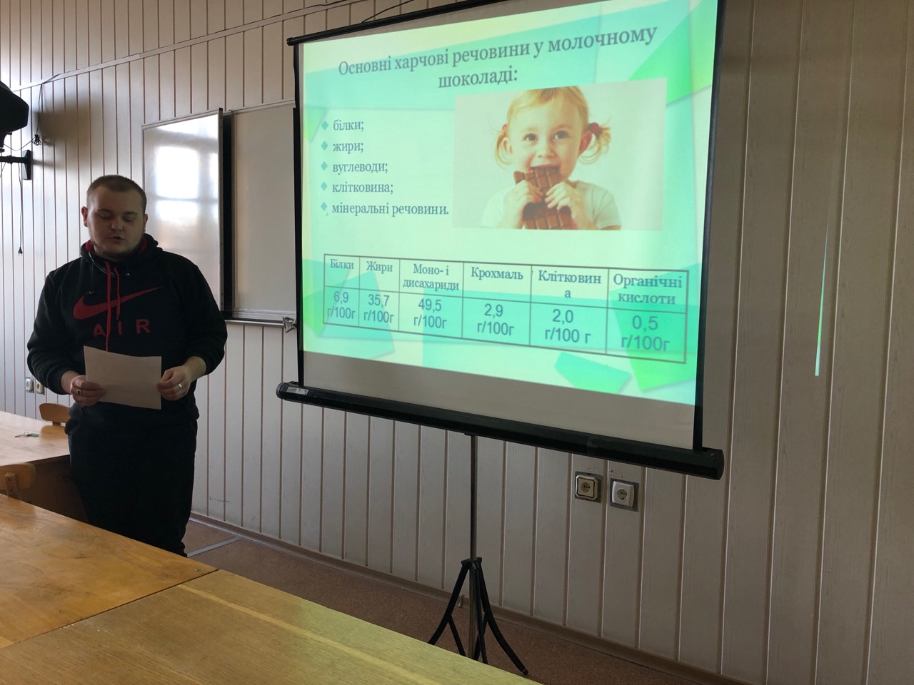 22 лютого 2019 року на факультеті торгівлі, маркетингу та сфери обслуговування у рамках проведення VIІ Фестивалю студентської науки доцентом кафедри товарознавства, експертизи та торговельного підприємництва Григоренко І.В. було проведено відкрите засідання студентського наукового гуртка «Теоретичні та практичні проблеми товарознавства» на тему «Якість та безпечність харчових продуктів». На засіданні були присутні члени гуртка: здобувачі вищої освіти груп ТКЛ-21д та ТКЛ-31та науково-педагогічні працівники кафедри. На засіданні було заслухано та обговорено такі доповіді: «Фальсифікація та імітація шоколаду» (Шевченко О.О.); «Ароматизатори в харчових продуктах» (Миленький Б.В.); «Товарознавча оцінка згущеного молока» (Брелова І.М); «Якість та безпечність газованих напоїв» (Єрємєєв Д.В.); «Безпечність продуктів «3 в 1»» (Щупак Д.О.).