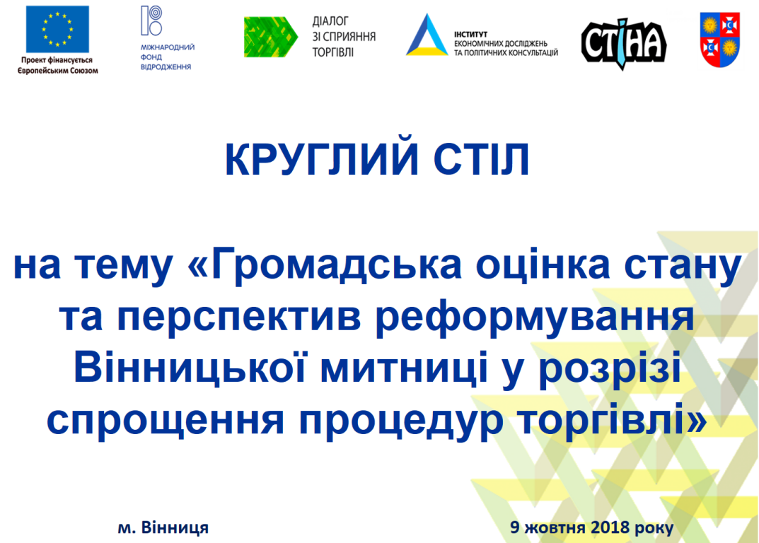 9 жовтня 2018 року в стінах Вінницького торговельно-економічного інституту КНТЕУ в рамках проекту: «Діалог зі сприяння торгівлі» (фінансується ЄС та МФ Відродження) за підтримки Вінницької облдержадміністрації, Інститутом економічних досліджень та політичних консультацій разом із Спілкою підприємців «СТІНА» проводився круглий стіл на тему: «Громадська оцінка стану та перспектив реформування Вінницької митниці у розрізі спрощення процедур торгівлі».