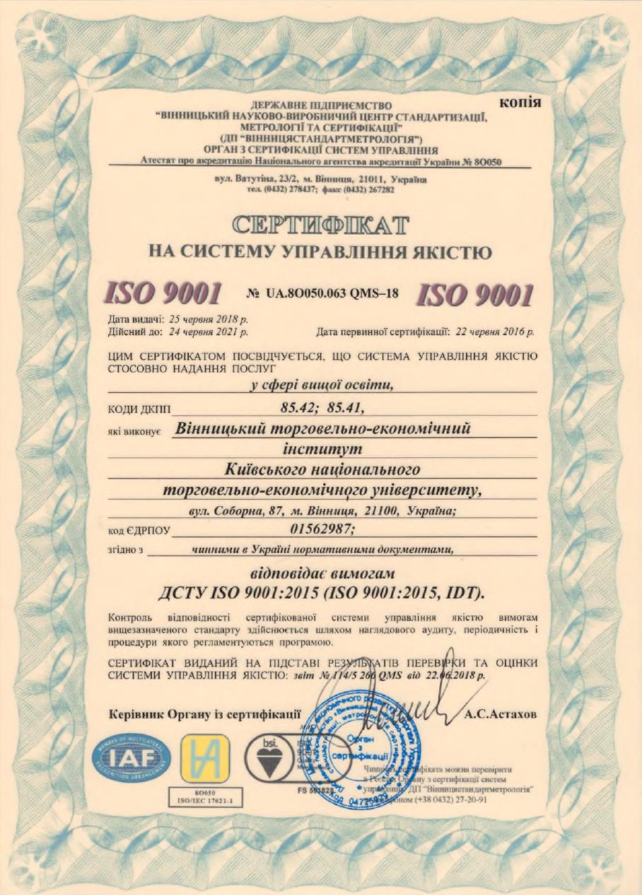 25 червня 2018 року колективу ВТЕІ КНТЕУ в особі директора інституту Замкової Н.Л. було вручено сертифікат на систему управління якістю, ресертифіковану на відповідність ДСТУ ISO 9001:2015 (ISO 9001:2015, IDT), який засвідчує високий рівень управління освітньою діяльністю та якість надання освітніх послуг. Попередньо, упродовж червня 2016 р. – червня 2018 р., в інституті функціонувала СУЯ, сертифікована відповідно до ДСТУ ISO 9001:2009 (ISO 9001:2008, IDT). Сертифікат вручила заступник генерального директора ДП «Вінницястандартметрологія» Іонова С.В.