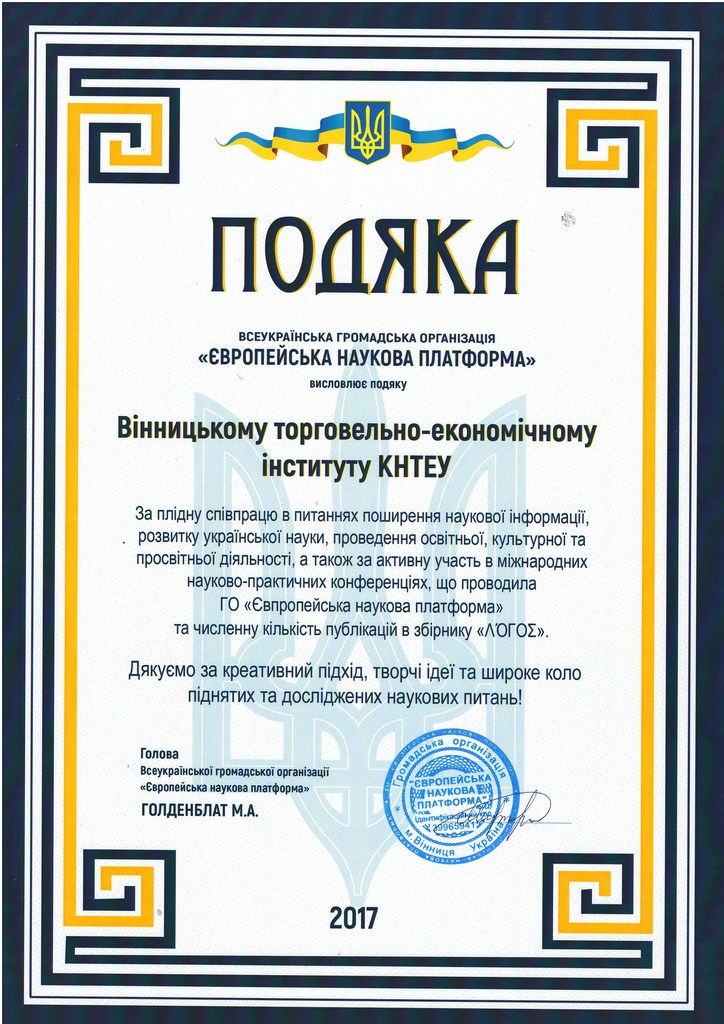 Всеукраїнська громадська організація "Європейська наукова платформа" висловила подяку ВТЕІ КНТЕУ за плідну співпрацю в питаннях поширення наукової інформації, розвитку української науки, проведення освітньої, культурної та просвітницької діяльності, а також за активну участь в міжнародних науково-практичних конференціях, що проводила ГО "Європейська наукова платформа" та численну кількість публікацій в збірнику "ЛОГОС".