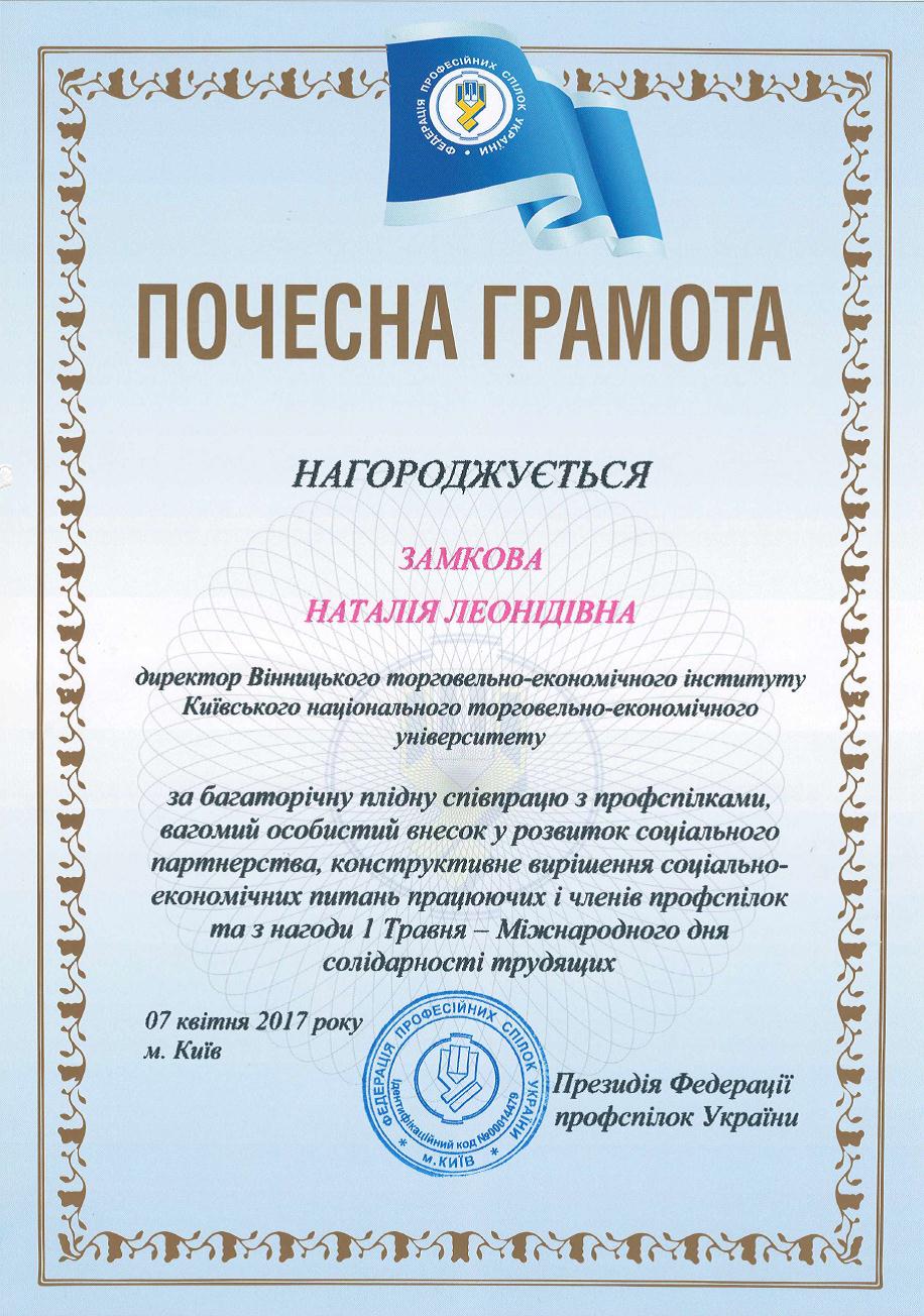 Почесною грамотою Федерації профспілок України нагороджено директора ВТЕІ КНТЕУ Замкову Н.Л. за багаторічну плідну співпрацю з профспілками, вагомий внесок у розвиток соціального партнерства, конструктивне вирішення соціально-економічних питань працюючих і членів профспілок та з нагоди 1 травня Міжнародного дня солідарності трудящих