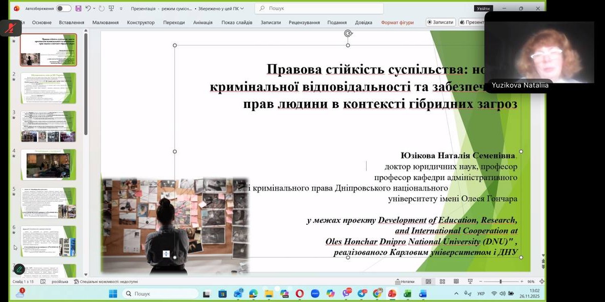 26 листопада 2025 року відбулася гостьова лекція за участю професора, доктора юридичних наук, професора кафедри адміністративного і кримінального права Дніпропетровського національного університету ім. Олеся Гончара, провідного українського фахівця у галузі кримінального права, кримінології та міжнародних стандартів правосуддя і гармонізації національного законодавства з європейськими стандартами верховенства права Юзікової Наталії Семенівни.