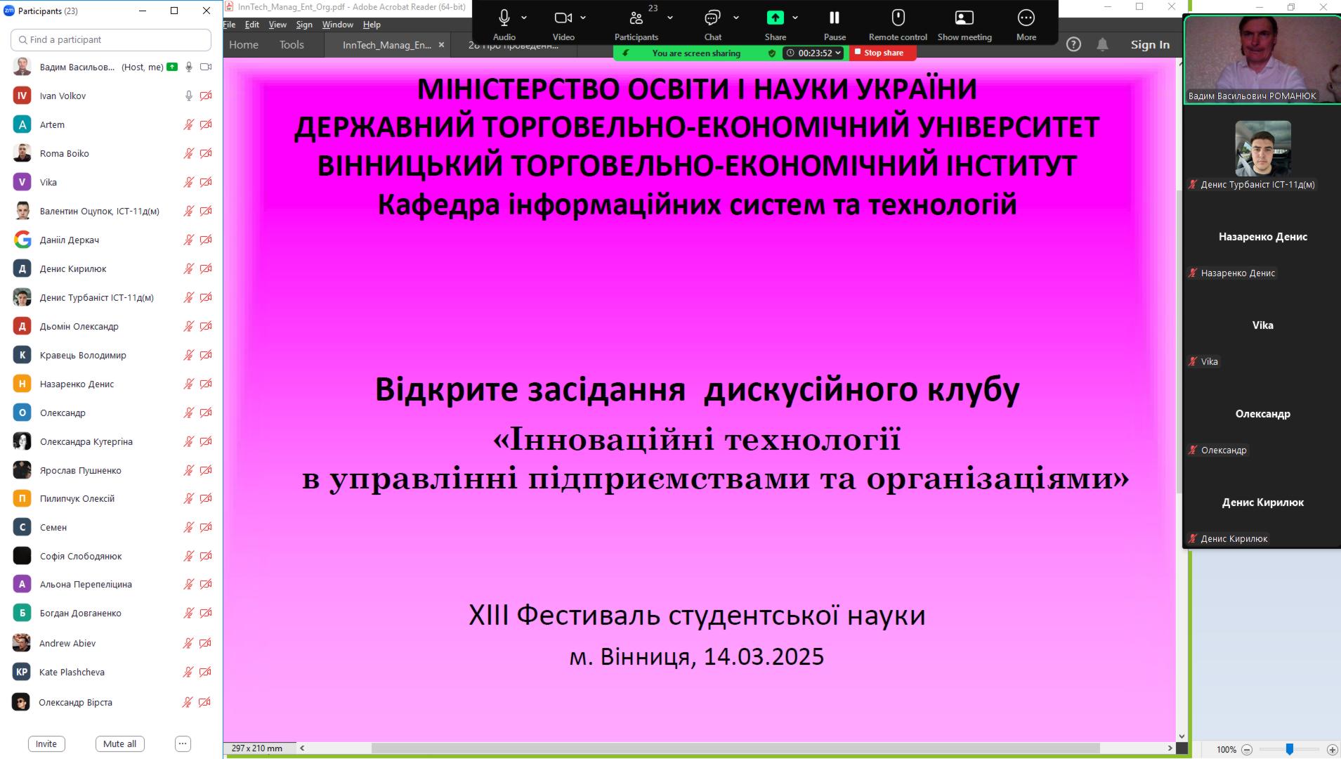 14 березня 2025 року в рамках проведення XIII Фестивалю студентської науки на факультеті економіки, менеджменту та права проведено відкрите засідання дискусійного клубу «Інноваційні технології в управлінні підприємствами та організаціями» на тему «Збір даних для використання штучного інтелекту у підприємництві». В засіданні дискусійного клубу взяли участь здобувачі ОС «магістр» та «бакалавр» освітньої програми «Інформаційні технології у бізнесі».