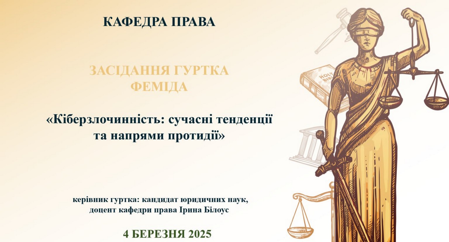 4 березня 2025 року в рамках ХІІІ Фестивалю студентської науки було проведено засідання наукового гуртка «Феміда» на тему «Кіберзлочинність: сучасні тенденції та напрями протидії», керівниця гуртка доцентка кафедри права Ірина Білоус.