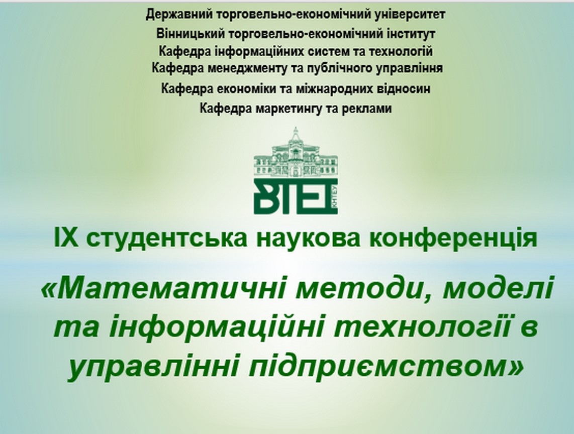 24 жовтня 2024 року відбулась ІХ студентська наукова конференція «Математичні методи, моделі та інформаційні технології в управлінні підприємством» в режимі онлайн на платформі Zoom. Захід проводився кафедрою інформаційних систем та технологій спільно з кафедрами менеджменту та публічного управління, економіки та міжнародних відносин, маркетингу та реклами.