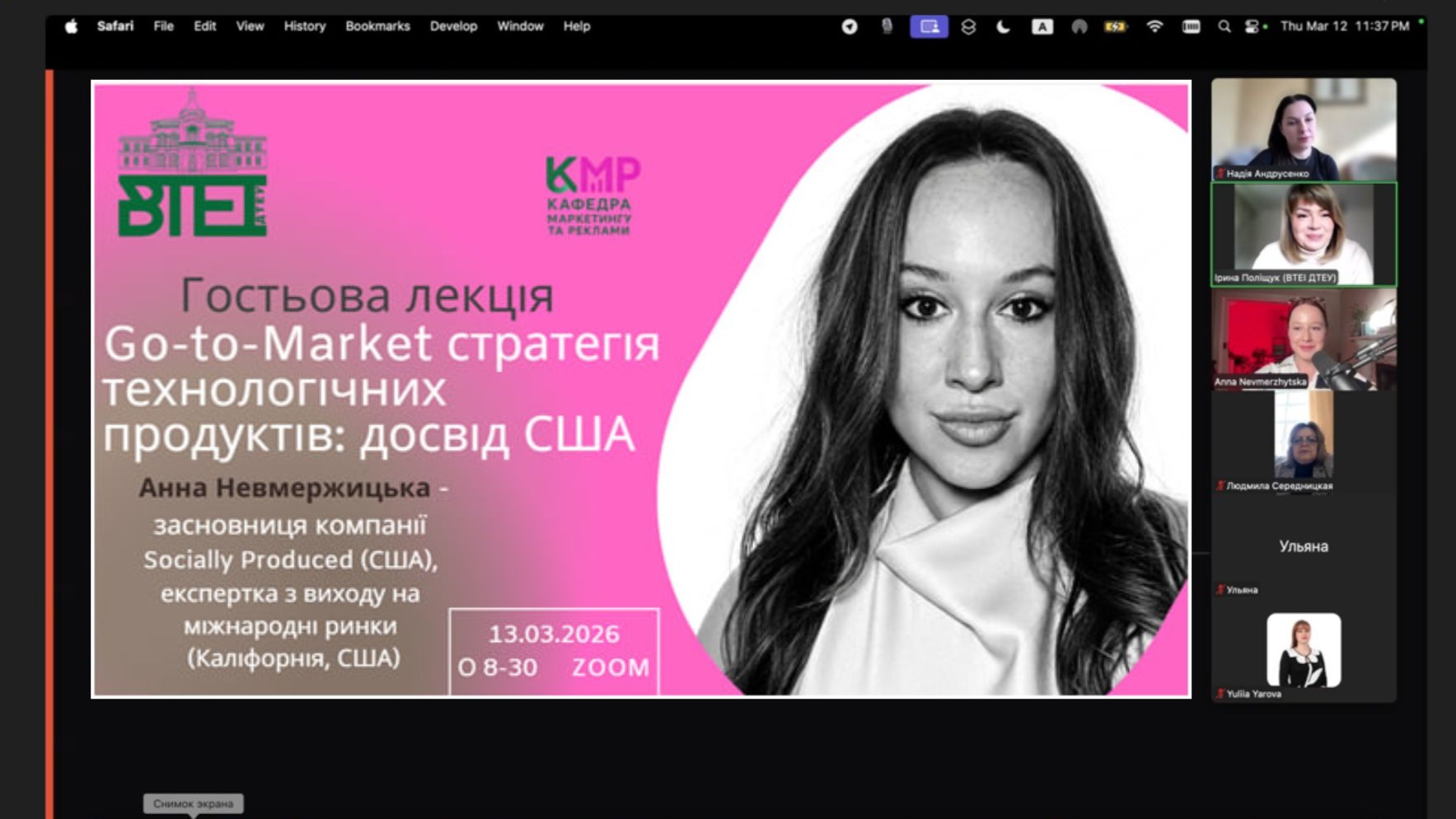 13 березня 2026 року відбулася гостьова лекція для здобувачів ОП «Маркетинг», «Логістика», «Реклама і зв’язки з громадськістю» на тему «GO-TO-MARKET стратегія технологічних продуктів: досвід США». Спікеркою заходу стала Анна Невмержицька – засновниця компанії Social Producer, експертка з виходу на міжнародні ринки (Каліфорнія, США).