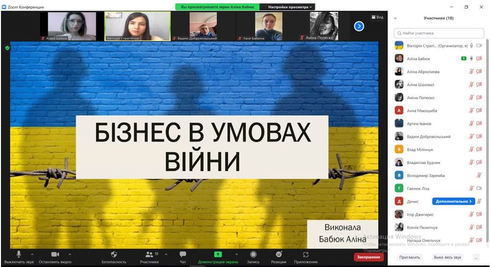 6 квітня 2022 року відбулося засідання наукового гуртка кафедри економіки та міжнародних відносин ВТЕІ ДТЕУ «Економіка бізнесу» на тему «Особливості функціонування вітчизняного бізнесу в умовах військового стану» (керівник гуртка доктор філософії, ст. викл. Вікторія Стратійчук).