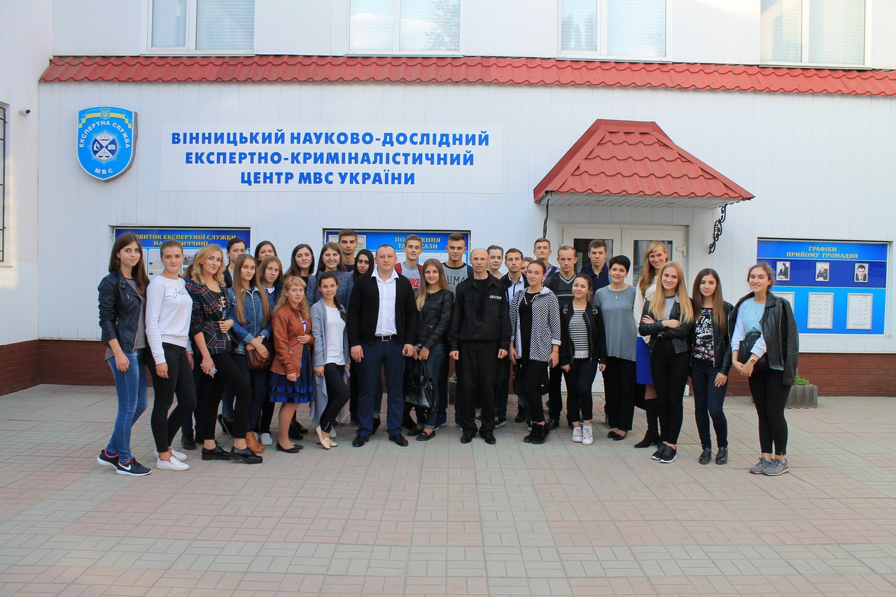 03 жовтня 2016 року студенти першого курсу спеціальності «Право» відвідали Вінницький науково-дослідний експертно-криміналістичний центр МВС України. Працівники криміналістичного центру ознайомили студентів із видами судових експертиз та досліджень, які проводять їх фахівці, та із діяльністю структурних підрозділів Центру. Також показали колекції вогнепальної та холодної зброї, які вилучені з незаконного обігу, роз'яснили правові аспекти володіння та зберігання зброї і боєприпасів, та наслідки необережного поводження з ними. Під час відвідування лабораторії досліджень наркотичних засобів, майбутнім правознавцям були продемонстровані досліджувані зразки наркотичних засобів, доведена інформація щодо сутності такого зла, як наркоманія, його наслідків та відсутності перспектив на подальше повноцінне життя. Ознайомча екскурсія для студентів була цікавою та корисною.