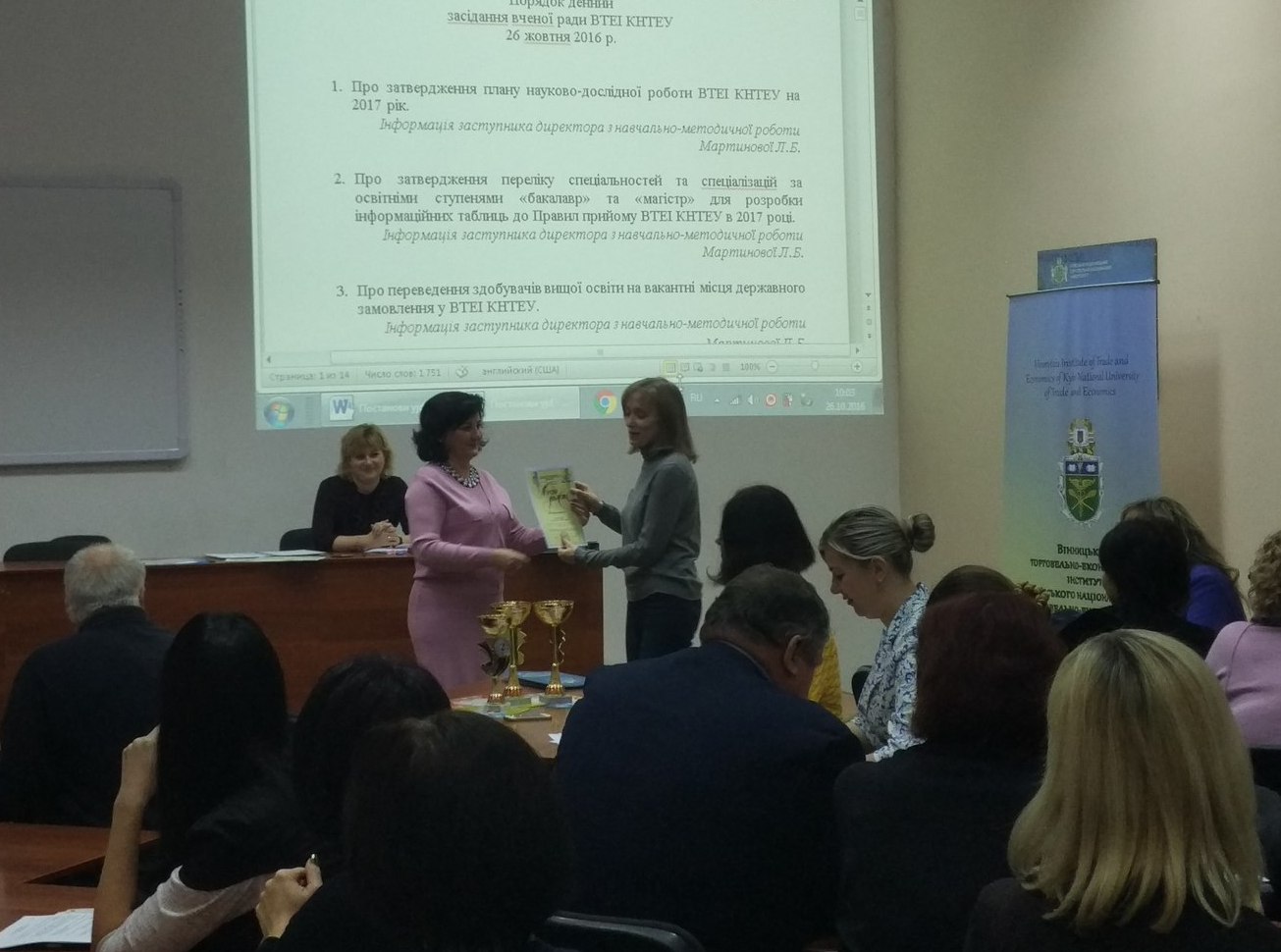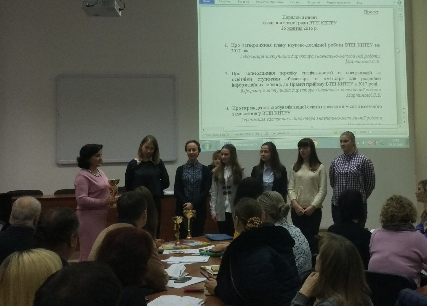 26 жовтня 2016 року відбулось засідання вченої ради ВТЕІ КНТЕУ, на якому були затверджені документи та ухвалені відповідні рішення згідно порядку денного.