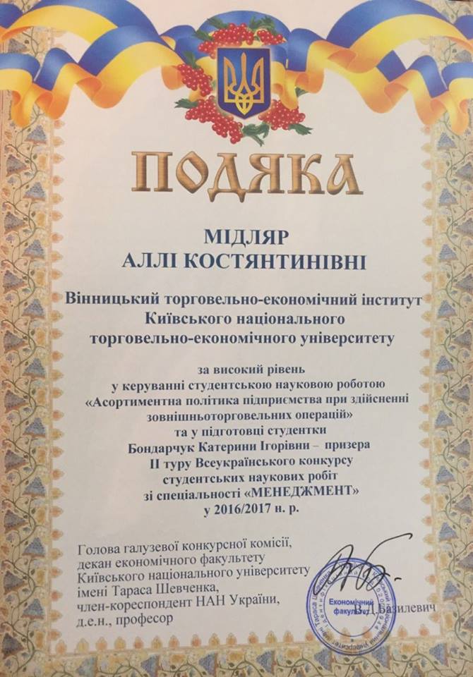 23 березня 2017 року на базі Київського національного університету імені Тараса Шевченка відбувся ІІ тур Всеукраїнського конкурсу студентських наукових робіт з природничих, технічних і гуманітарних наук зі спеціальності «Менеджмент». Серед авторів найкращих наукових студентських робіт – здобувач вищої освіти освітнього ступеня «магістр» Бондарчук Катерина (науковий керівник – к.е.н., доцент Мідляр А.К.).