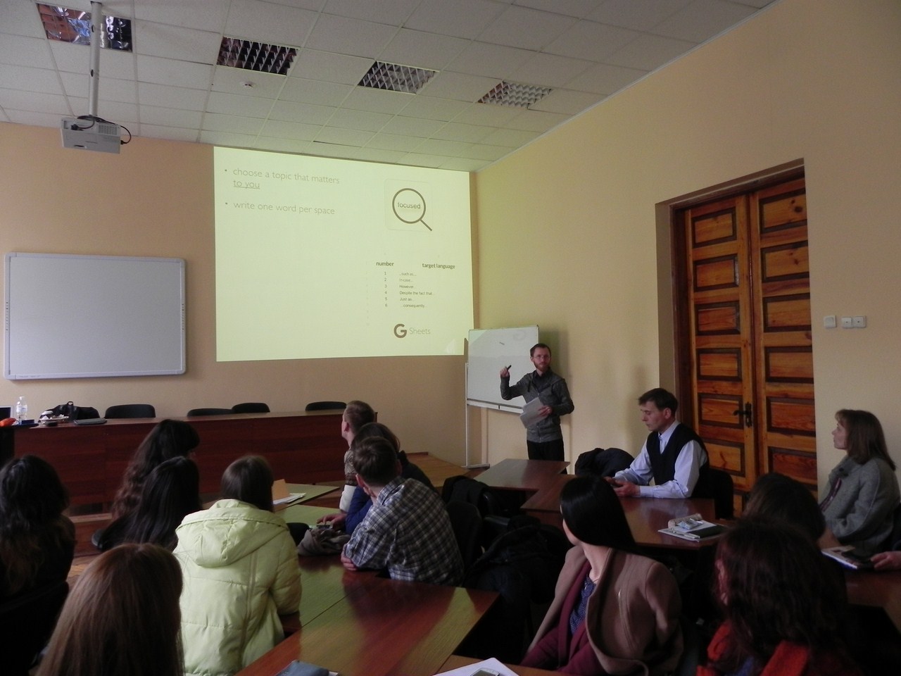 В рамках круглого столу був організований тренінг «Narrative Language: Including Discourse Markers for Greater Learner Fluency», проведений американським фахівцем з англійської мови Тадеушем Макклеарі, який працює в Україні за програмою Секції зв’язків з громадськістю Амбасади США. В ході тренінгу запропоновано цікаві підходи до вирішення низки проблемних питань лінгвістичного, соціально-комунікативного та психологічного аспектів комунікації в академічному і професійному середовищі.