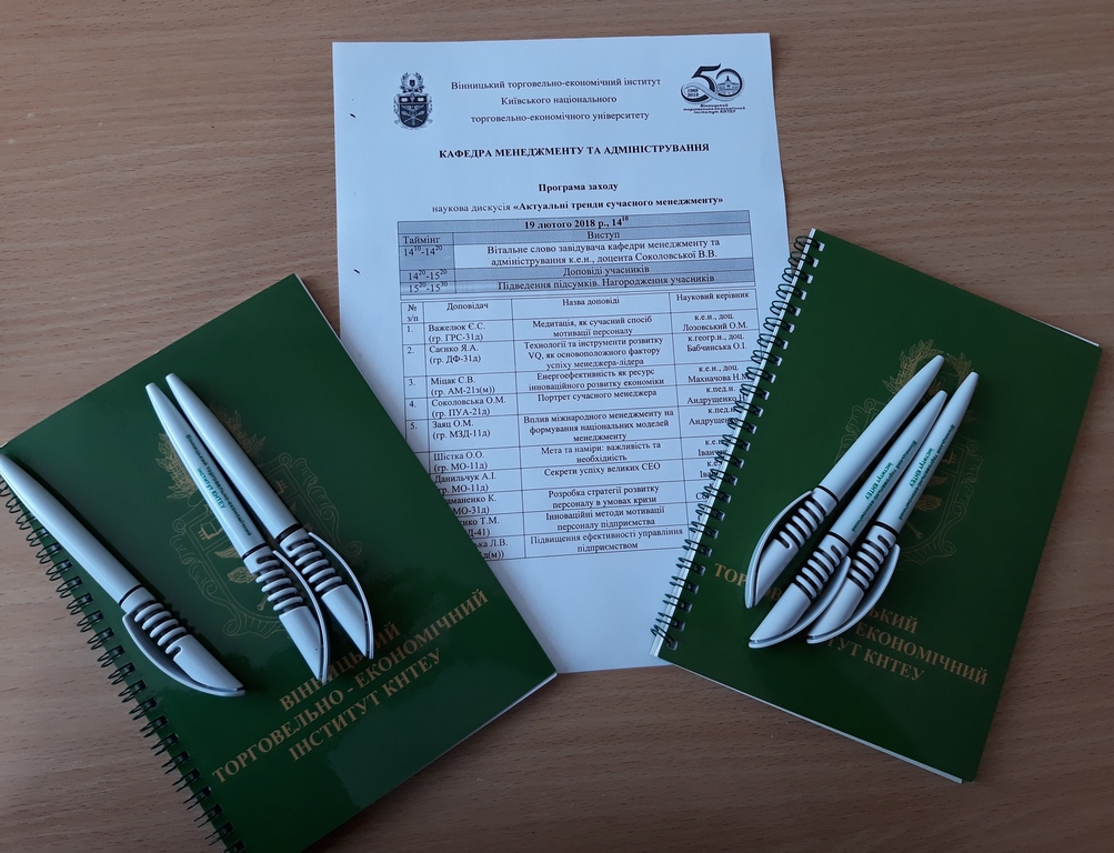 19 лютого 2018 року кафедрою менеджменту та адміністрування було організовано та проведено наукову дискусію: «Актуальні тренди сучасного менеджменту», яка мала на меті визначити особливості сучасних умов ведення бізнесу, проаналізувати світові тренди управління та визначити місце потенціалу керівників і технологій у вітчизняному менеджменті. Модератором даного заходу була завідувач кафедри менеджменту та адміністрування к.е.н., доцент Соколовська В.В.