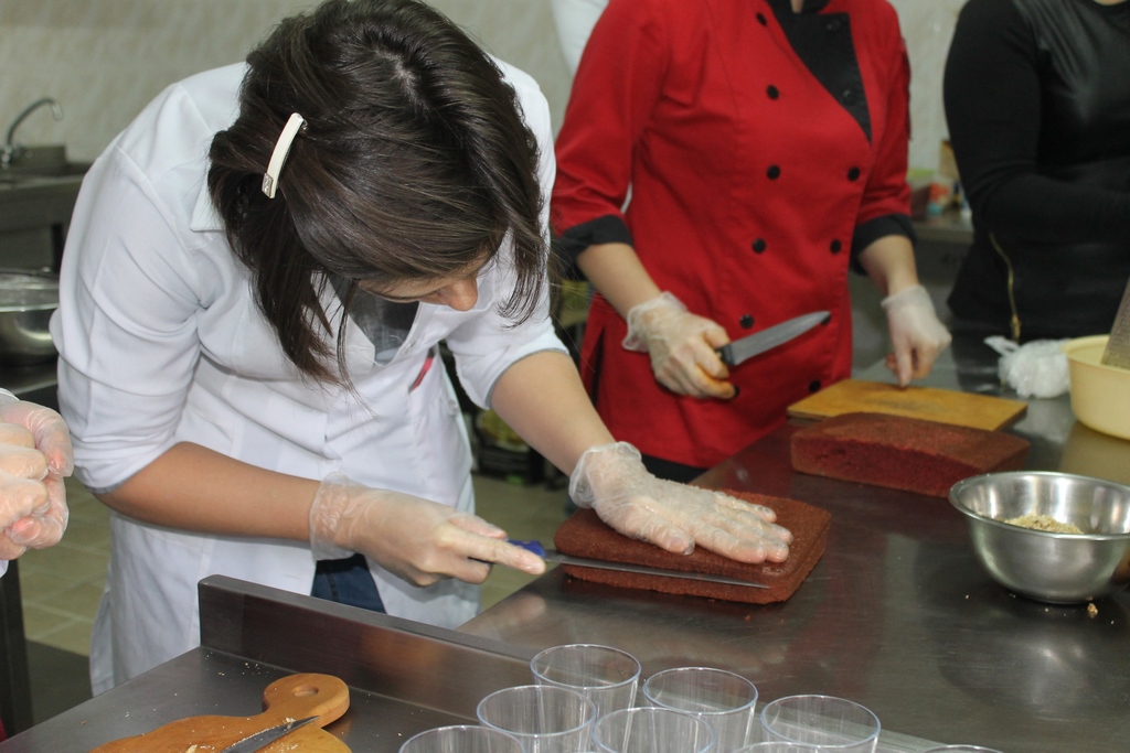 Бойко Галина продемонструвала технологію приготування сучасних десертів кенді-бару, а саме тістечок «Картопля» з шоколадною глазур’ю та десертів у стаканчиках трайфлів з використанням бісквіту «Червоний оксамит», гарбузового та шоколадного бісквіту на кип’ятку. Кожен учасник мав змогу виготовити свій трайфл та «Картоплю», ознайомитися з сучасними тенденціями у кондитерському мистецтві, особливостями технології різних кремів, конфітюру, оздоблювальних виробів та ін. Три години роботи пройшли у жвавій виробничій атмосфері у колі шанувальників кондитерської справи під керівництвом компетентного практика. Це дало можливість здобути не тільки нові корисні знання, але й практичні навички, без яких сьогодні молодим фахівцям-харчовикам неможливо досягти успіху та бути конкурентоспроможним на ринку праці.