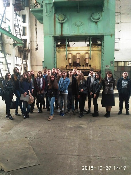 Цікаву та змістовну екскурсію для студентів та викладачів провів головний технолог Шусь Василь Васильович. Досвідчений спеціаліст з понад 30-річним стажем поділився з молоддю інформацією про підприємство, розповів про його структуру (основні цехи та їх спеціалізацію), зокрема повідомив, що державне підприємство входить до Державного концерну «Укроборонпром». Завод є провідним підприємством з виробництва технічних засобів транспортування, заправки, перекачування і зберігання нафтопродуктів. На підприємстві є унікальне обладнання, потужна документально-технічна база, яка дозволяє виконувати індивідуальні замовлення на виготовлення різних виробів за ескізами або кресленням замовника з чорних та нержавіючих сталей, а також з кольорових металів.