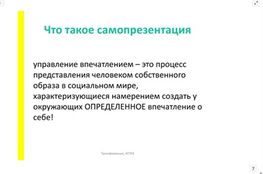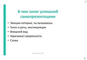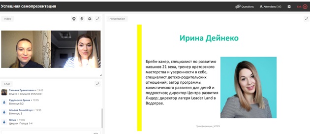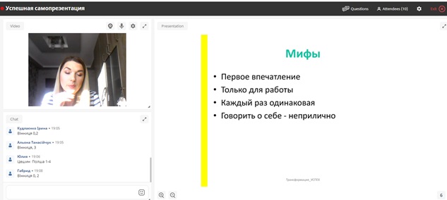 Сьогодні від фахівців з розвитку навичок 21 століття почули про те, як управляти враженнями про себе, про мистецтво самопрезентації у різних життєвих ситуаціях. Актуальною для учасників веб-семінару була інформація про те, як успішно пройти інтерв'ювання при прийомі на роботу, адже при поганій самопрезентації можна втратити можливості мати хорошу роботу. Дякуємо "Трансформація - Успіх" , Ірині Дейнеко та Ользі Маліхатко за можливість прийняти участь у веб-семінарі!