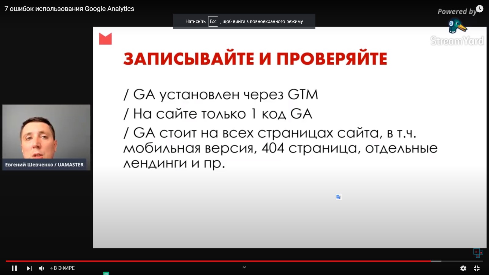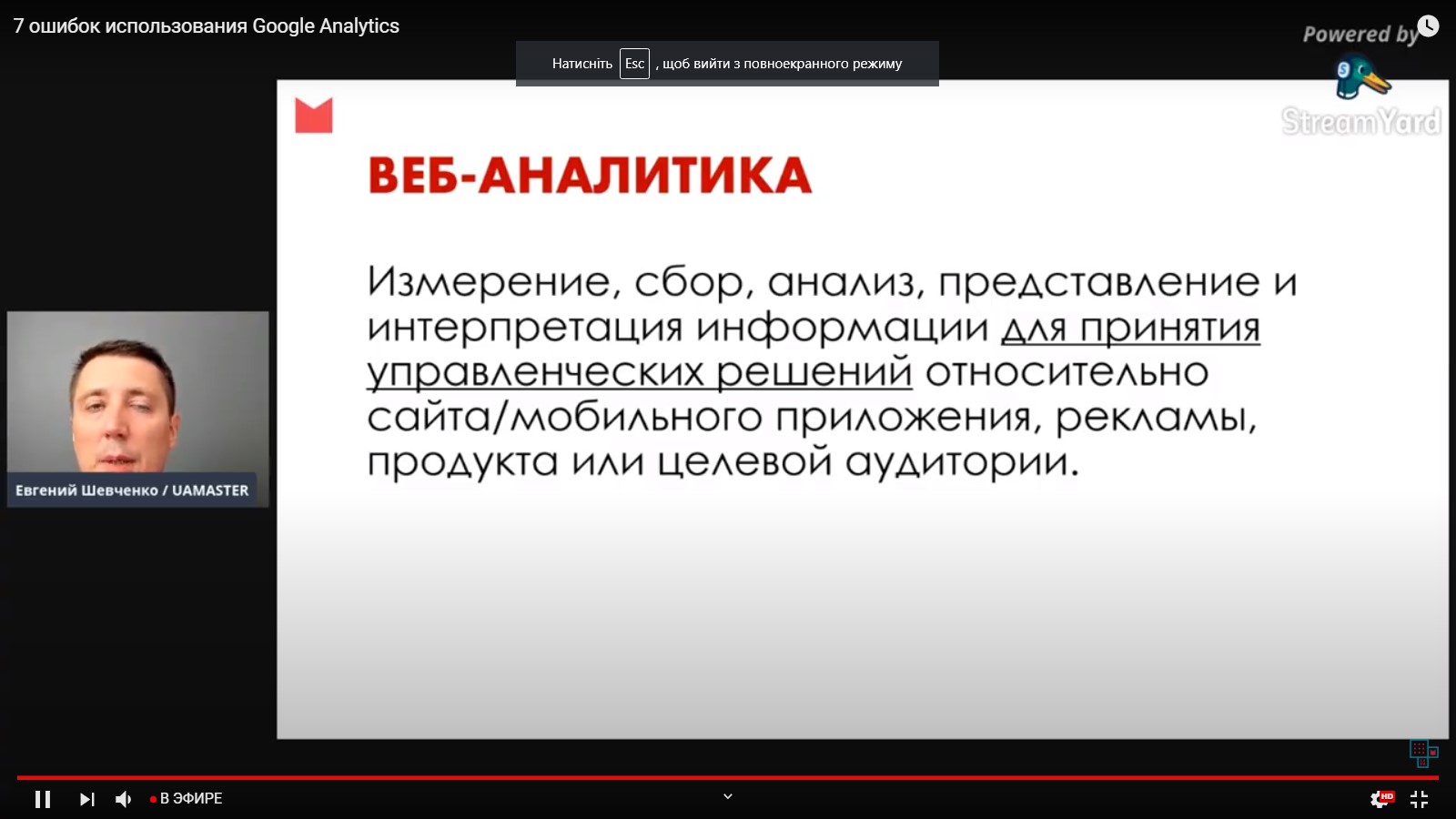 8 вересня 2020 року викладачі та здобувачі вищої освіти ВТЕІ КНТЕУ брали участь у відкритій онлайн лекції "7 помилок використання Google Analytics" від Євгенія Шевченко, фахівця Digital Marketing Strategist, засновника School of Digital Advertising UAMASTER.