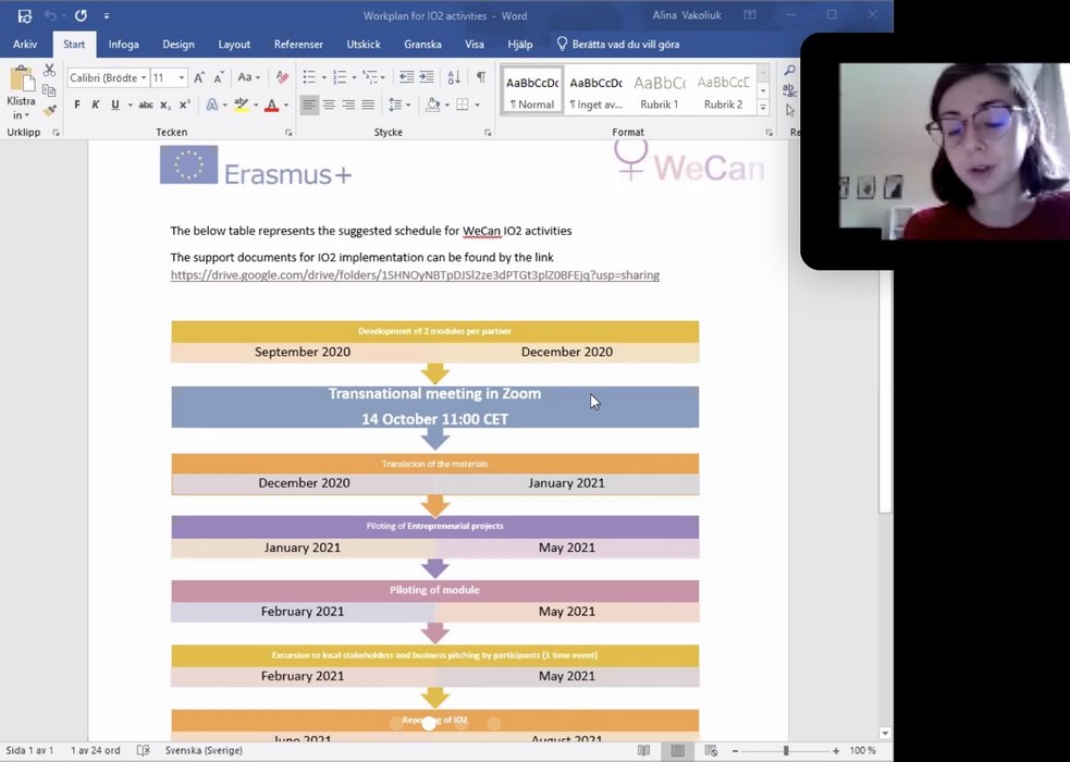 14 жовтня 2020 року відбулася Третя транснаціональна зустріч партнерів проекту WeCan зі Швеції, Нідерландів, Великої Британії, Кіпру, Греції та України. Керівник проекту Аліна Ваколюк (Фолькуніверситет, Швеція) представила концепцію та часові рамки другого етапу проекту. Під час виконання даного етапу проекту партнери планують розробити тренінги з формування підприємницьких та інших соціальних навичок у жінок-переселенок. Тематика тренінгів розроблятиметься на основі аналітичних досліджень першого етапу проекту та потреб цільової групи.
