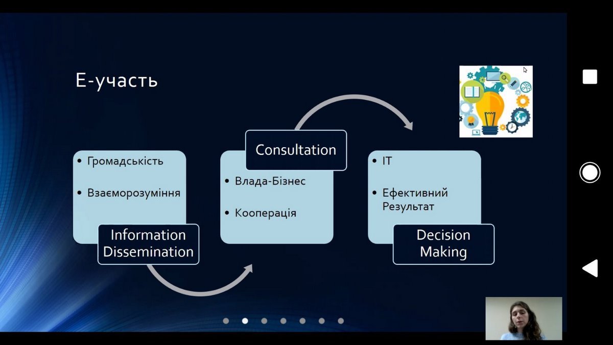 Наукова студія «Цифрова трансформація в громадах» кафедри менеджменту та адміністрування (керівник – доцентка Ніколіна І.І.) розпочала цикл онлайн-зустрічей з експертами Програми «Електронне урядування задля підзвітності влади та участі громади» (Програма EGAP), мета яких – відкрити для студентів, що навчаються за спеціальністю «Публічне управління та адміністрування» нові аспекти їхньої майбутньої професійної діяльності.