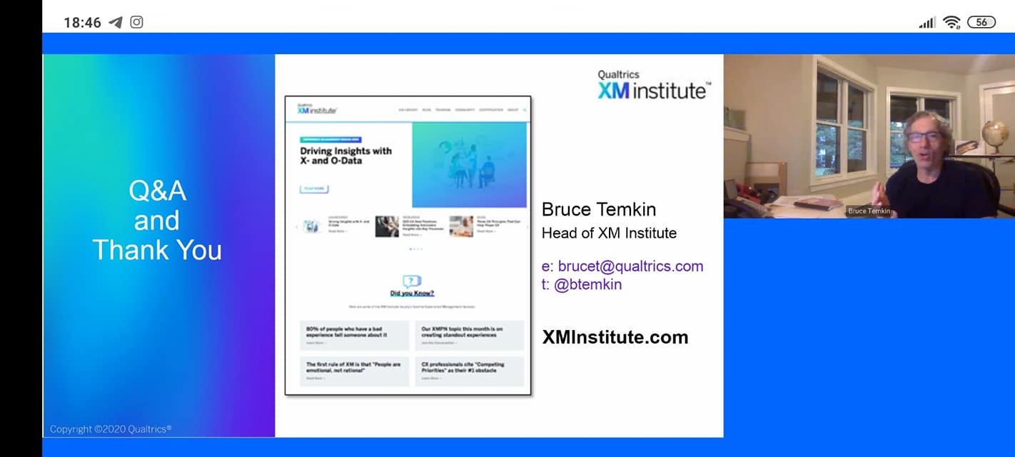 Спікер вебінару - Bruce Temkin, Head Qualtrics XM Institute розповів про досвід взаємодії з клієнтом, запропонував шляхи покращення можливостей взаємодії з клієнтами завдяки кращим навичкам та технологіям.