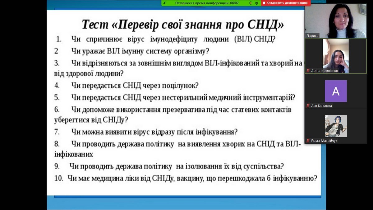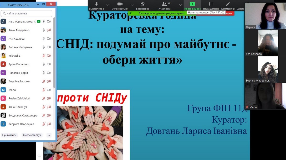 Під час кураторських годин студентами разом з викладачами обговорювались основні шляхи передачі та заходи запобігання зараження ВІЛ, аналізувались статистичні дані щодо поширення ВІЛ-інфекції по Вінницькій області, Україні та світу, піднімались питання толерантного ставлення до ВІЛ-позитивних людей. Всі кураторські години проводились у форматі відеоконференцій з переглядом інтерв’ю, освітніх відео- та презентаційних матеріалів. Студенти навіть мали змогу перевірити свої знання про СНІД за допомогою тесту.