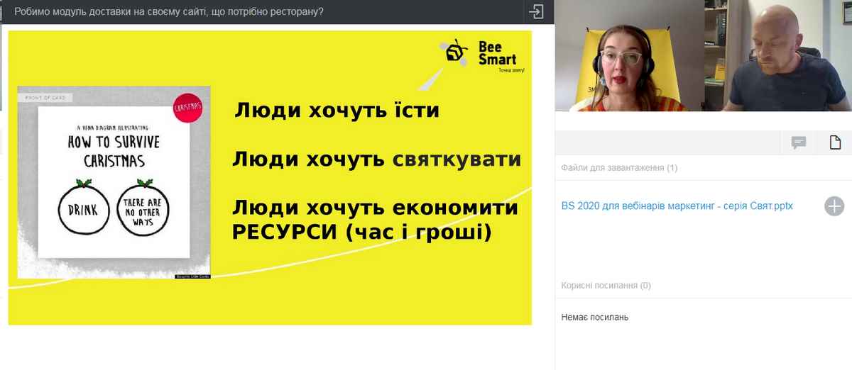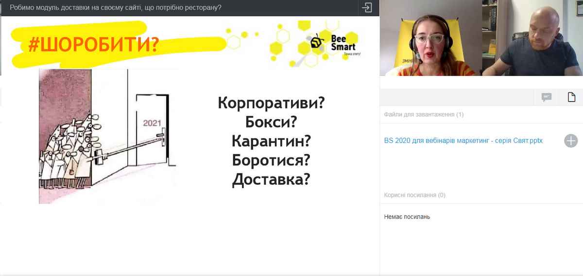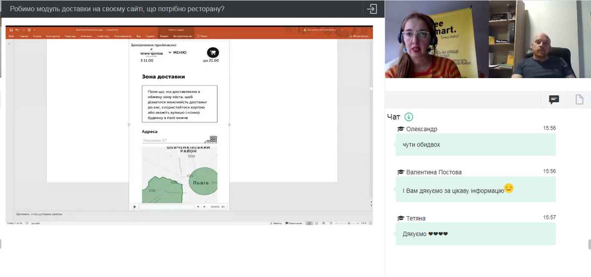 17 грудня 2020 р. науково-педагогічні працівники кафедри туризму та готельно-ресторанної справи, здобувачі вищої освіти, які навчаються за спеціальностями «Харчові технології», «Готельно-ресторанна справа», взяли участь у вебінарі «Робимо модуль доставки на своєму сайті, що потрібно ресторану?», який відбувся в рамках міні-курсу «Як правильно запустити доставку?».