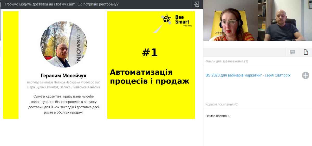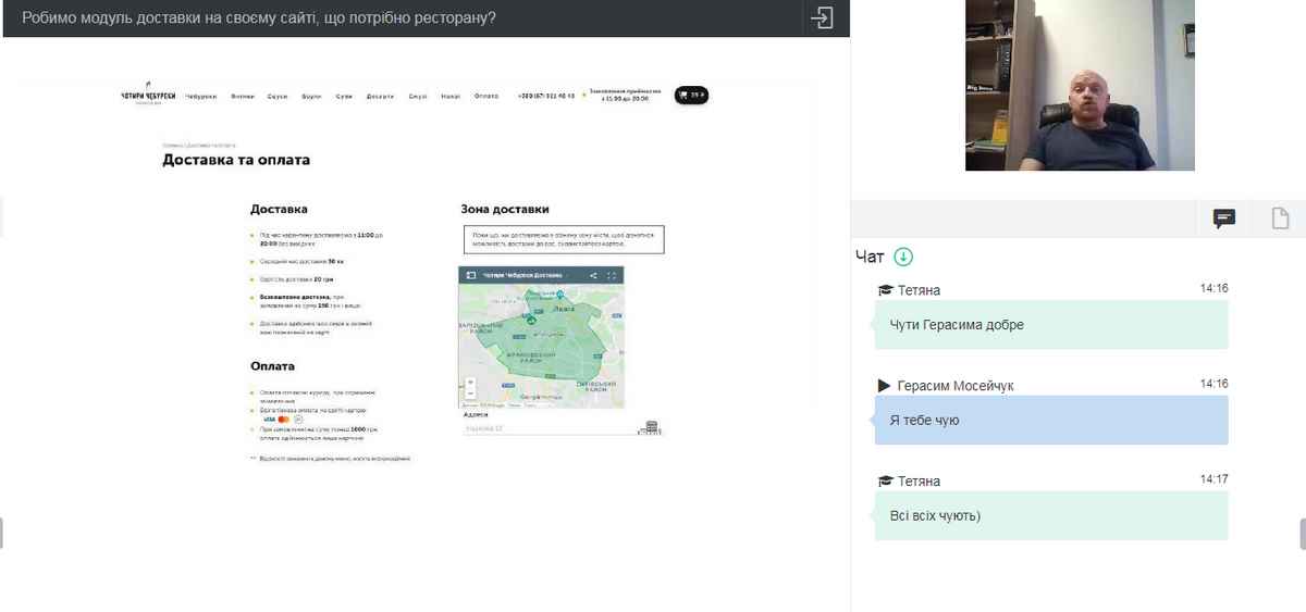 Доповідачем виступив Герасим Мосейчук – партнер закладів «Чотири Чебуреки. Prosecco Bar», «Пара булок і компот», «Велика львівська канапка». Саме він в карантин і кризу взяв на себе налаштування бізнес-процесів із запуску доставки для 3-х закладів, яка досі зростає в обсягах продажу. Були обговорені питання щодо розробки сайту по доставці страв закладів ресторанного господарства; як саме має працювати і який вигляд повинен мати даний сайт, щоб функціонально привертати увагу. Визначено, як працювати на доставці та як просувати власний заклад на ринку конкурентів. Доповідач детально описав, яка повинна бути проведена робота з клієнтом дистанційно, щоб його не втратити, та як дистанційно йому «посміхнутись», щоб він ще не один раз скористався послугами закладу.
