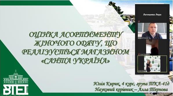 21 квітня 2021 року дистанційно на платформі Zoom було проведено засідання секції №8 «Сучасне товарознавство: інновації, проблеми якості та безпеки» в рамках X Всеукраїнської студентської науково-практичної конференції «Актуальні проблеми ефективного соціально-економічного розвитку України: пошук молодих».