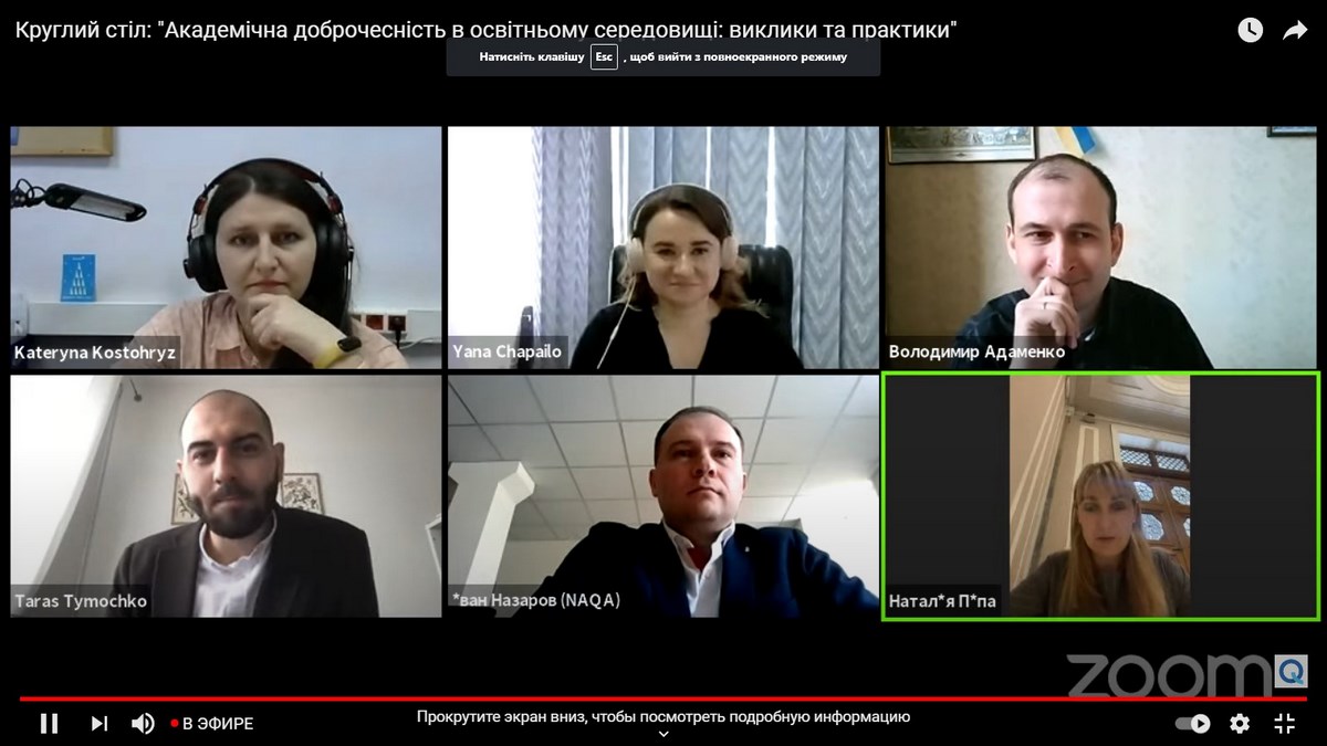 Учасники круглого столу ознайомилися з практичними кейсами розроблення та впровадження університетських політик академічної доброчесності в Україні, дізналися як налагоджується процес комунікації зі студентами та викладачами, які необхідні ресурси для забезпечення академічної доброчесності використовуються різними закладами вищої освіти, як здійснюється моніторинг за дотриманням академічної доброчесності.