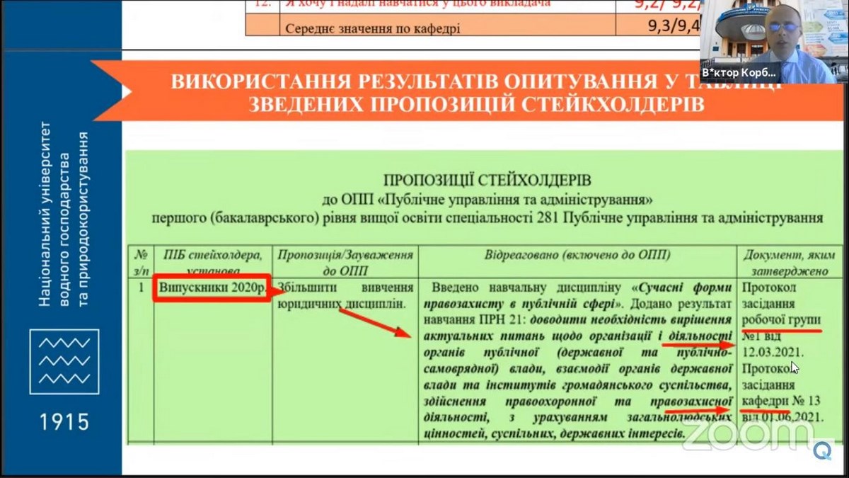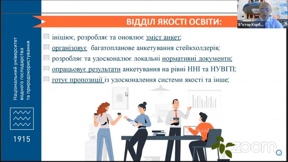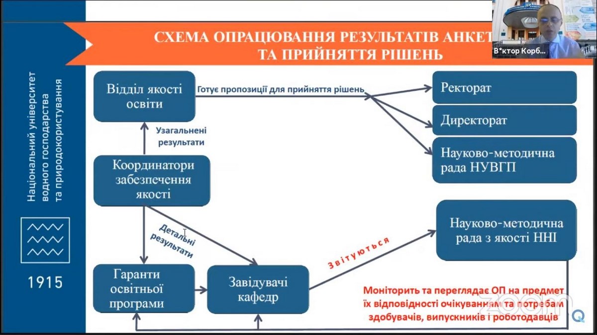Спікер заходу – Віктор Корбутяк, доцент, кандидат технічних наук, начальник відділу якості освіти Національного університету водного господарства та природокористування (м. Рівне), експерт Національного агентства забезпечення якості вищої освіти запропонував на розгляд методи проведення опитування та визначив можливості для покращення системи анкетування у ЗВО.